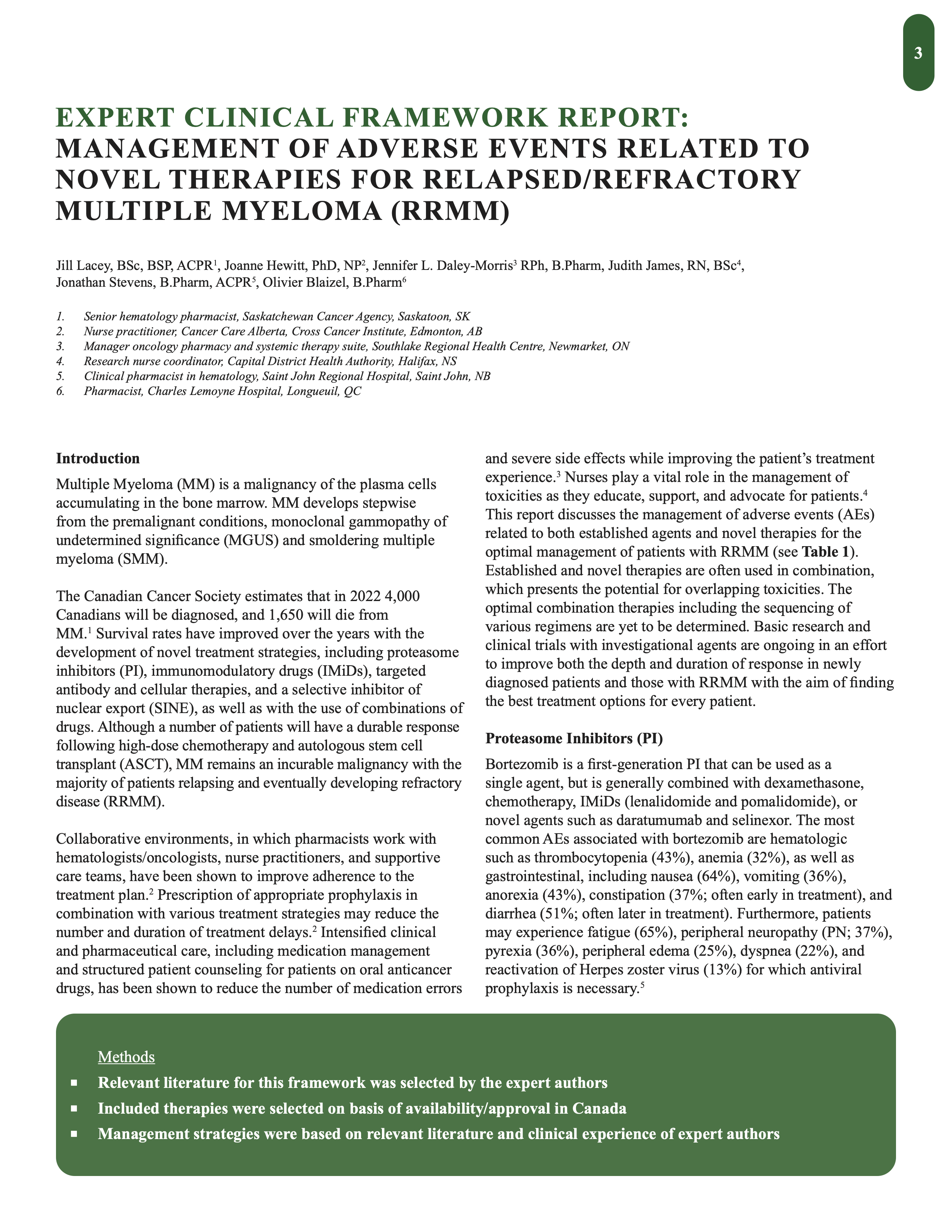 The Canadian Cancer Society estimates that in 2022 4,000 Canadians will be diagnosed, and 1,650 will die from MM. Survival rates have improved over the years with the development of novel treatment strategies, including proteasome inhibitors (PI), immunomodulatory drugs (IMiDs), targeted antibody and cellular therapies, and a selective inhibitor of nuclear export (SINE), as well as with the use of combinations of drugs. Although a number of patients will have a durable response following high-dose chemotherapy and autologous stem cell transplant (ASCT), MM remains an incurable malignancy with the majority of patients relapsing and eventually developing refractory disease (RRMM).